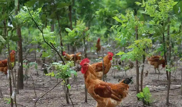 在农村有着大量的林地,尤其山区,这些林地下空间大,地面有较多的各类虫子,是放养鸡群的重要场地。林地内适合各种类型鸡群的放牧养殖。一些山区为了防止水土流失也种植了大片的杂木林,当树龄超过5年后,树根扎得比较深,固土和保墒能力较强,用于生态养鸡也是比较理想的。